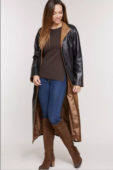 This luxurious full-length leather coat will see you through spring, summer, and fall in style. Striking and elegant, the Vickie is made of silky-soft Napa lambskin leather and has a long, flattering cut that suits every figure. Classic style features include a stand-up collar, roll-back cuffs, a four-button front, and two slip pockets. A 20" back slit lets you lengthen your stride in comfort. Contrasting leather on the collar, cuffs, and front piping give this leather coat a fetching finish.