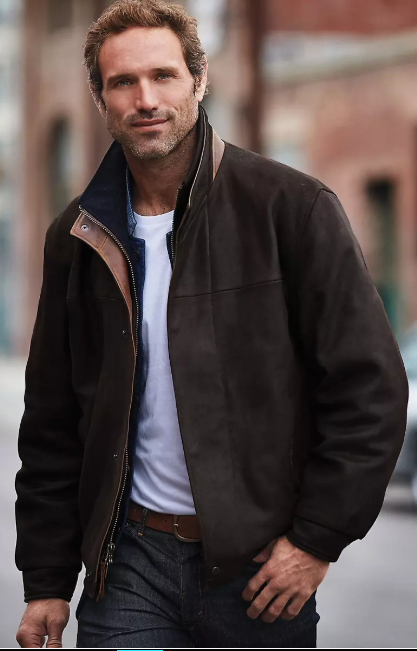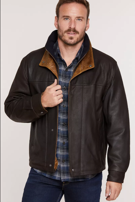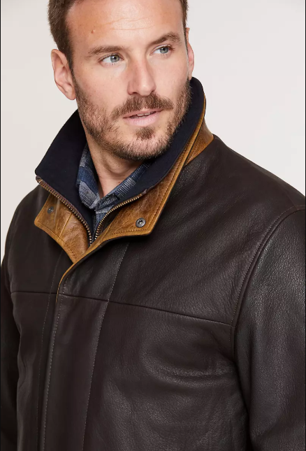 Beautifully crafted and built to last. Made of soft yet durable Kildare goatskin, the Romano Leather Jacket boasts a fine pebbled grain and rugged character that suits country and city gentlemen alike. Italian calfskin trim lines the front placket and pocket entry for contrast and added strength, while wool-blend lining with Thinsulate ensures cozy warmth on hardworking winter days. Zip up the front, snap the storm flap, and enjoy the double-collared protection the Romano coat affords. Adjustable snap cuffs, vertical front pockets, and two interior pockets finish this handsome design.