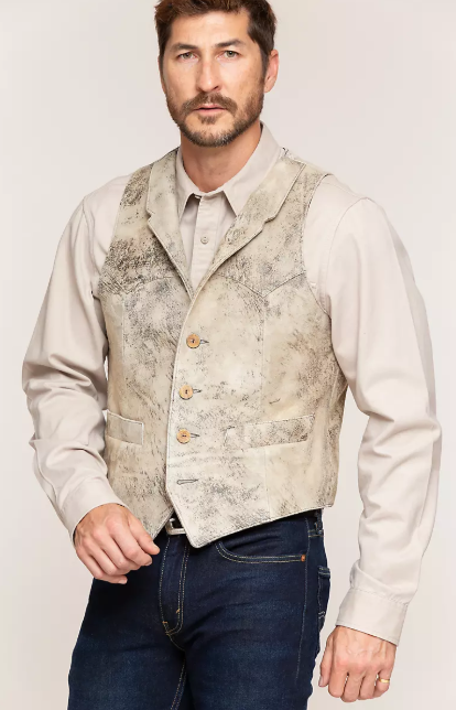 Our Shelton Suede Vest is a true smooth character. Made of distressed, sueded lambskin, it boasts a supple hand and a rugged vintage look. Whether you're kicking back or heading out, this handsome vest can't be beat for great looks and authentic Western style. Features include four decorative buttons, two outside slit pockets, one inside pocket, and a notch collar.