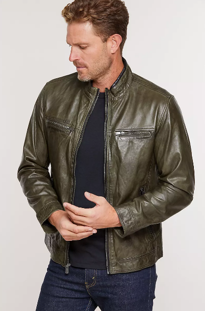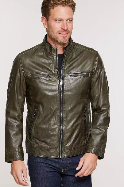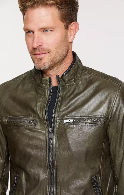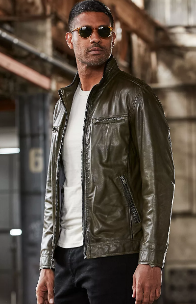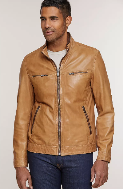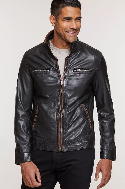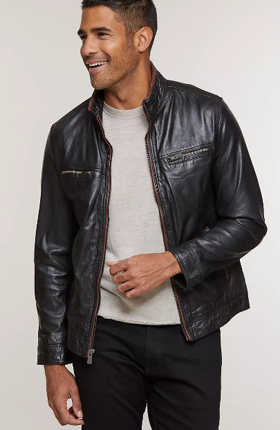 This zip-front, go-to leather moto jacket is a versatile wardrobe staple. Crafted from smooth, lightweight lambskin, the Stanley is equal parts gentleman and rebel. Perfect for in-between weather, it has four outside zip pockets and three inside the cotton-satin lining. The funnel collar has contrast piping for a handsome finish. Banded cuffs and hem.