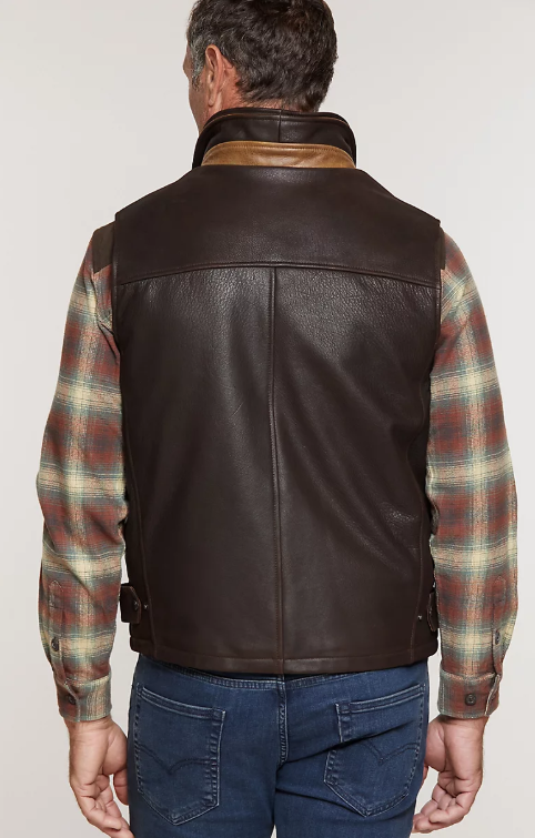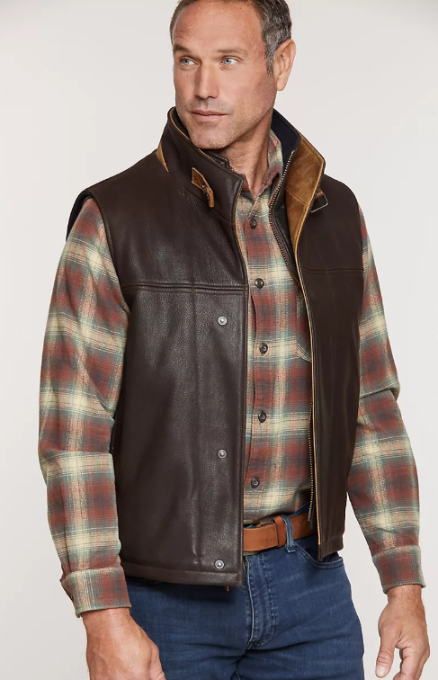 Our fashionable Traveler Vest offers you warmth in a resilient and eye-catching design. Made of drum-dyed French goatskin, this vest combines handsome good looks with great durability and flexibility. The soft wool/cashmere lining teams up with a lightweight layer of Thermolite insulation to keep you snug and warm even when the mercury bottoms out. Features a double collar with Italian calf trim, a placket front, two side-entry front pockets, side tabs for bottom length adjustment, and a handy inside pocket with zipper closure.