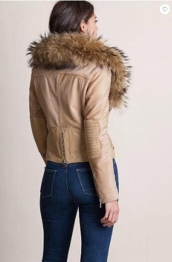 Gun your engines and prepare to look sensational. The Starr is a work of art that gives you two styles in one showpiece moto jacket. The removable raccoon fur collar adds pizzazz to a contemporary jacket that dresses you with plenty of oomph. Beautifully crafted in calfskin leather with a natural hair-on texture, the asymmetrical zip front jacket with double snap collar has zippers at the cuffs, at the vertical hand pockets, and even at the rear hem, accenting a contrast panel of smooth leather that straps and snaps around the sides. Quilted leather patches reinforce the elbows in a fashionably fitted jacket that rules the road. Polyester lined.