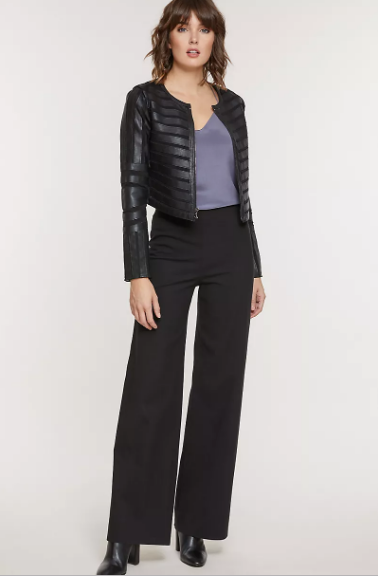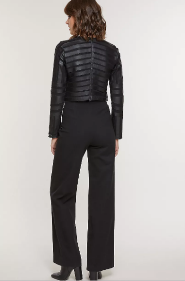 Supple lambskin leather alternated with sheer nylon creates a chic horizontal design that steals the show. Worn with dresses, skirts, pants, or jeans, indoors or out, this spiffy little leather jacket makes a proud showing at evening events, business meetings, or weekend travel. The Coco Lambskin Leather Jacket includes a zip front closure, zip cuffs, nylon lining, for a cropped, on-trend jacket that adds juice to every outfit.