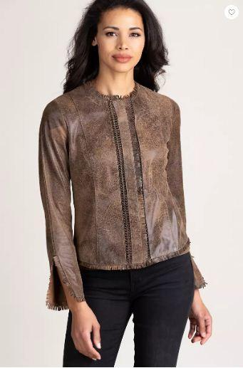 A chic, inventive style that speaks for itself, our distressed lambskin leather jacket showcases gently fringed edges. The front placket fastens with hidden magnets, while hand-woven, laser-cut leather detail accents the front and back. A standout.