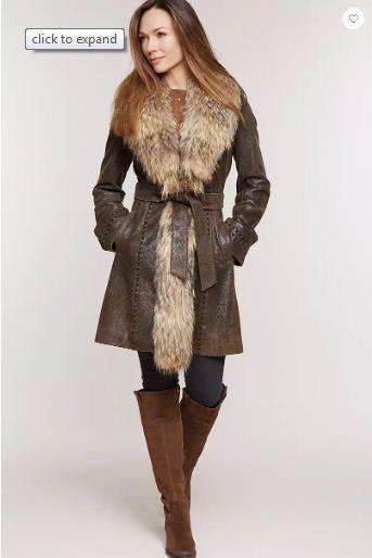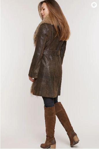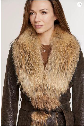Worn with or without the sash belt, the Felicity is cut for a flattering silhouette and detailed for beauty. It’s fashioned in distressed lambskin leather with a gently frosted sparkle, lavished in thick raccoon fur, and accented with leather pick stitching down the front and circling the flared cuffs. Acetate twill lining.