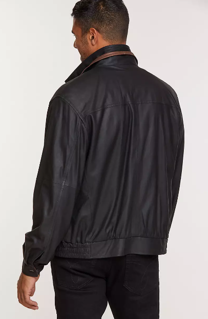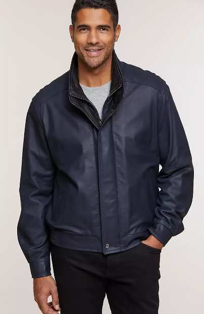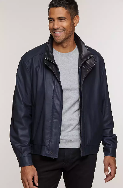 Head out for the day and stay out all night in our handsome Landon Bomber Jacket, and you'll feel as great as you look. Made of smooth, durable lambskin leather, it's a true American classic that won't weigh you down. Classic bomber style features include a zip front, two slip pockets, and a storm flap with two snap closures that keeps the weather out. A distinctive double collar with contrasting leather adds a unique touch. Designed for a great fit, this fine lambskin coat has adjustable snaps at cuffs and elastic inserts at the hemline. Three inside security pockets keep the essentials safe. Fully lined.
